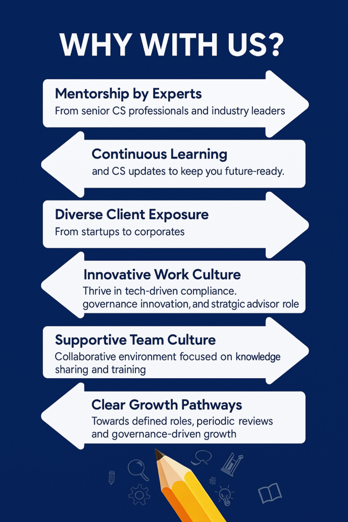 We believe in teamwork, integrity, and continuous learning. Our team benefits from direct mentorship, challenging assignments, and access to the latest tools and technologies to deliver high-quality services. Join us to be a part of a firm that values your contribution, supports your career goals, and helps you build a strong foundation in corporate governance.